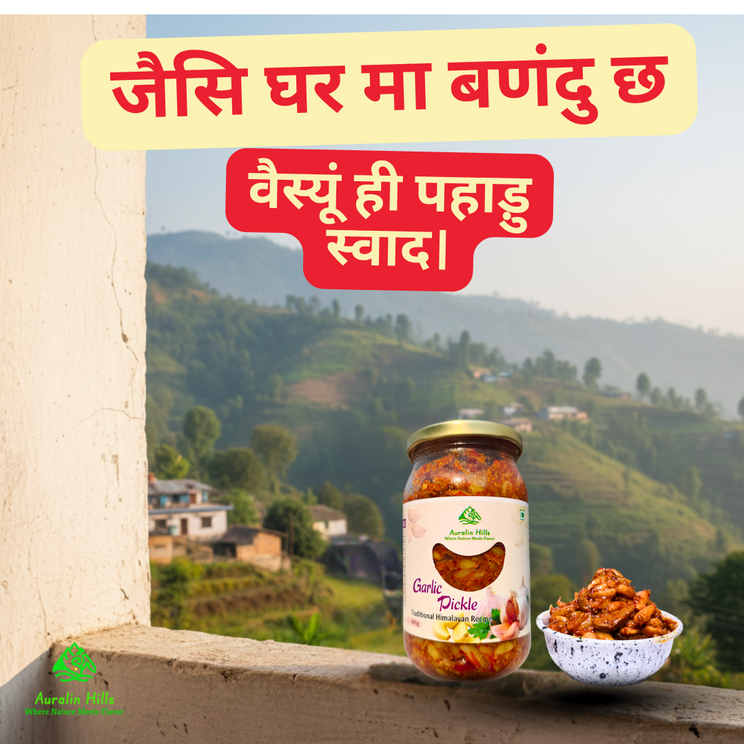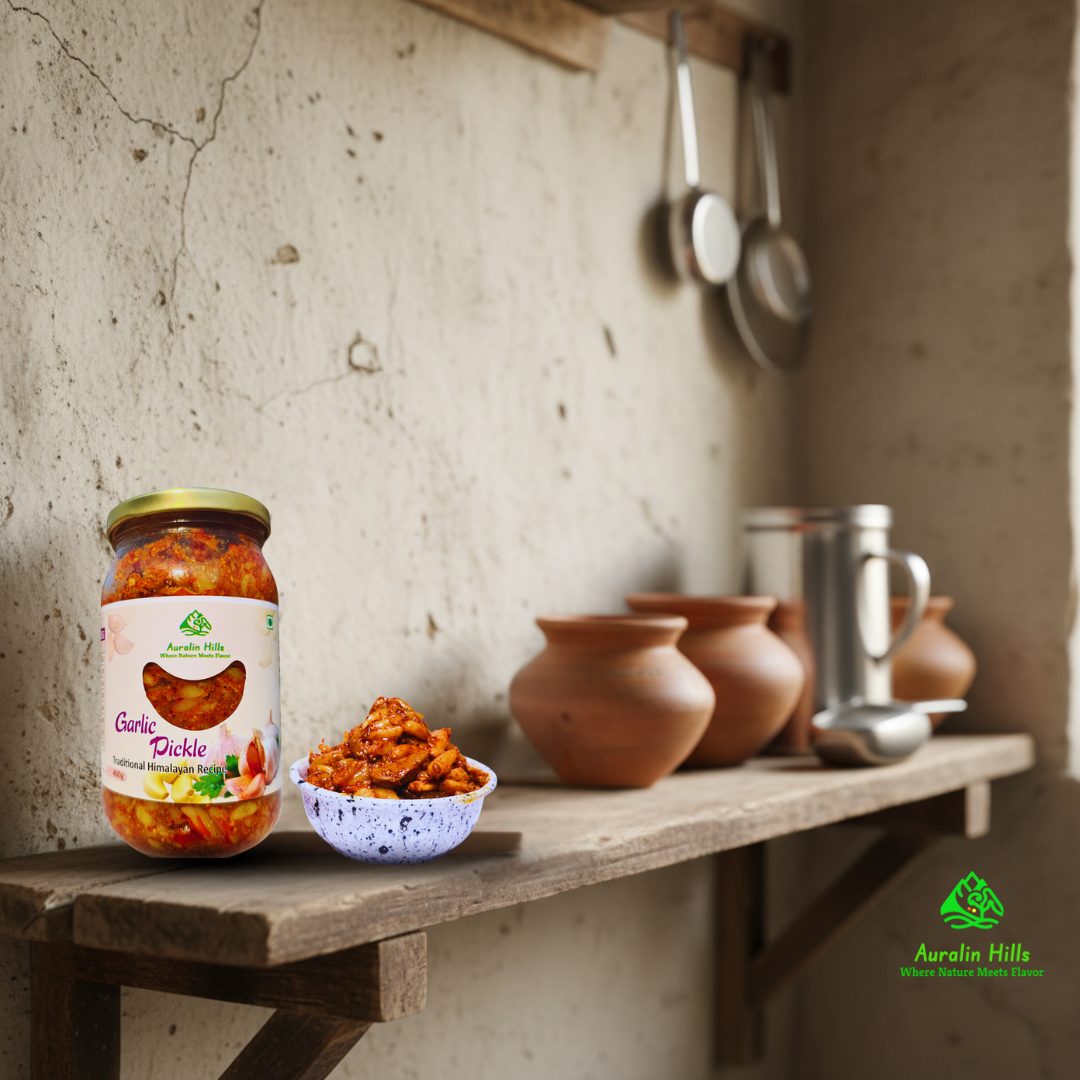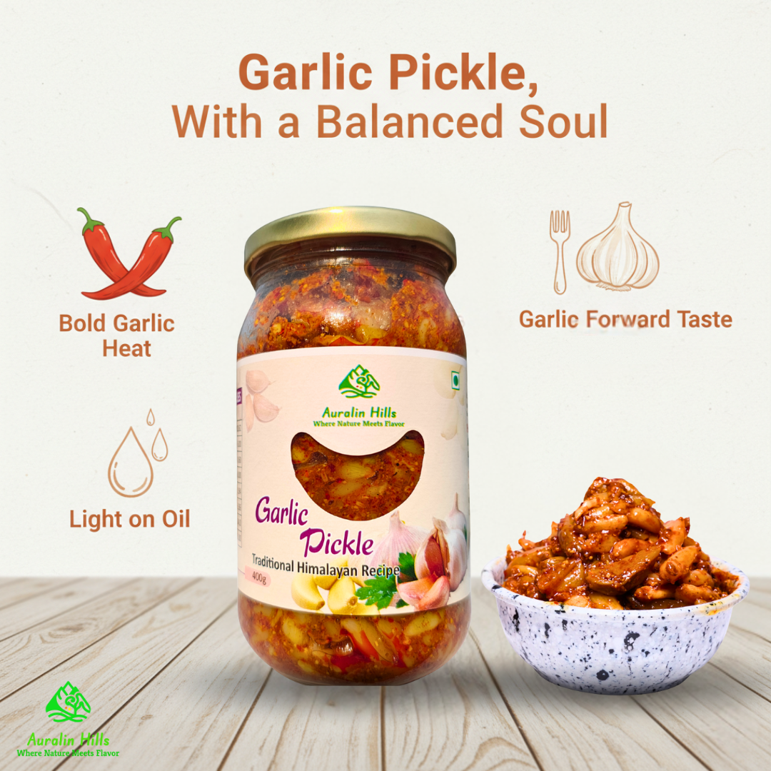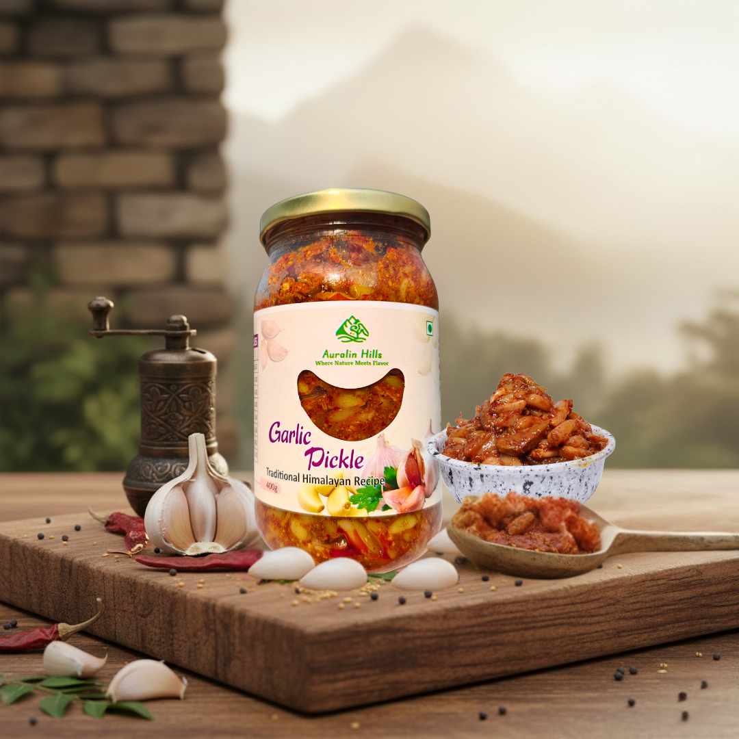 Auralin Hills Himalayan Garlic Pickle is a traditional Indian pickle crafted using an authentic pahadi recipe inspired by Himalayan kitchens. Prepared with fresh, whole garlic cloves and carefully selected spices, this pickle delivers a bold, aromatic, and deeply satisfying flavour. Every jar reflects the rich food heritage of the mountains, where pickles are made slowly, naturally, and with great attention to taste and quality.